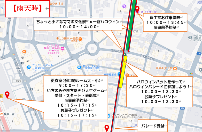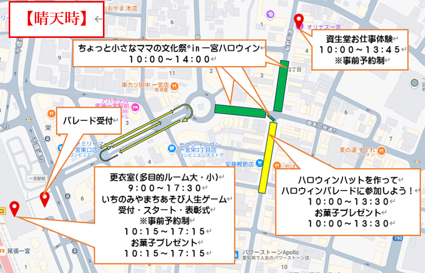 駅周辺で開催されるイベントのうち、「ちょっと小さなママの文化祭」のイベント会場と「ハロウィンパレード2025」のパレードルート、受け付け会場は、晴天時と雨天時で場所が異なりますので、お間違えの無いようにご来場ください。(下段の地図をご参照ください)